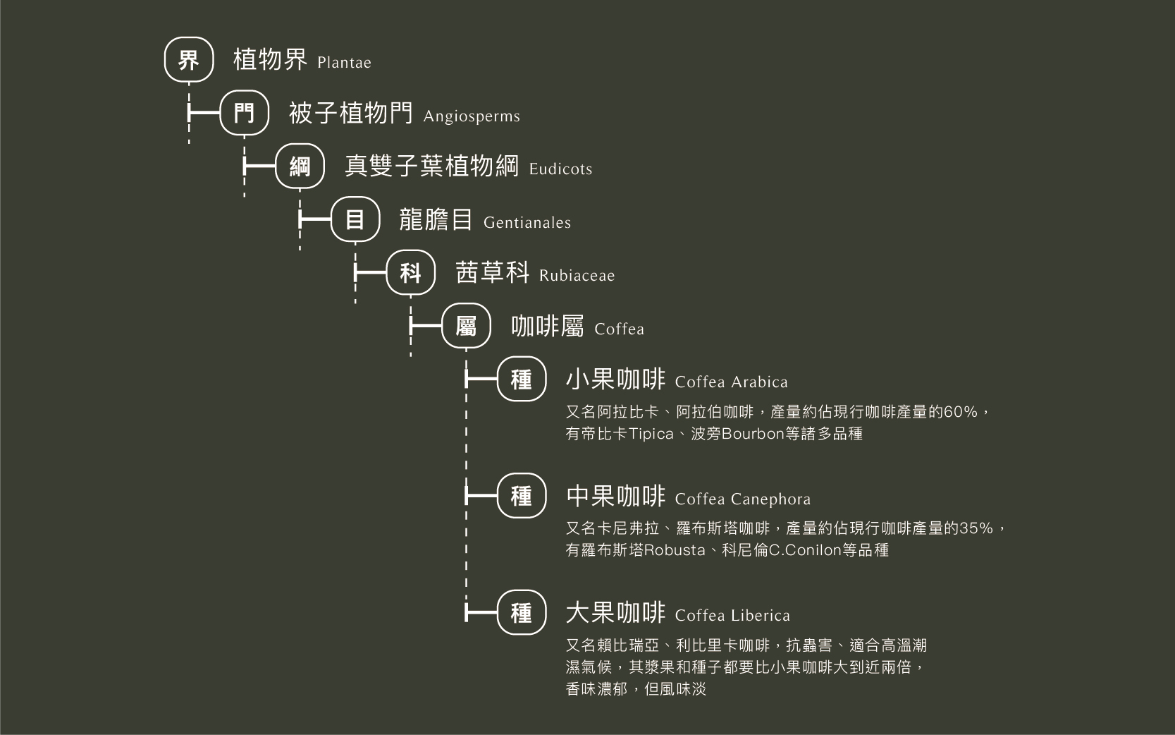 咖啡樹屬於被子植物門雙子葉植物綱茜草科咖啡屬,咖啡屬的植物約有70種,其中有兩種重要的商業作物,一種是小果咖啡 Coffee Arabica,另一種是中果咖啡 Coffee Canephora。