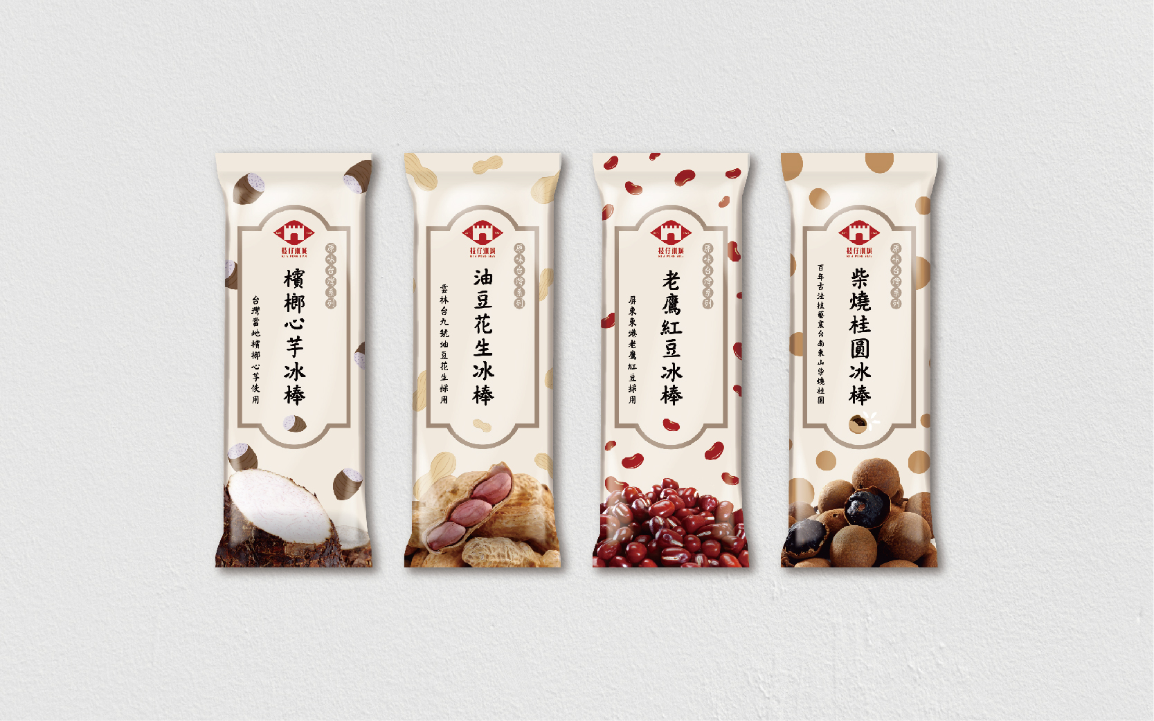 原料攝影配合插畫圖騰,同時展現產品新鮮感與趣味性。品項名稱文字部分,以手寫風格之書法字型呈現,形塑傳統系列冰品之經典復古氛圍。