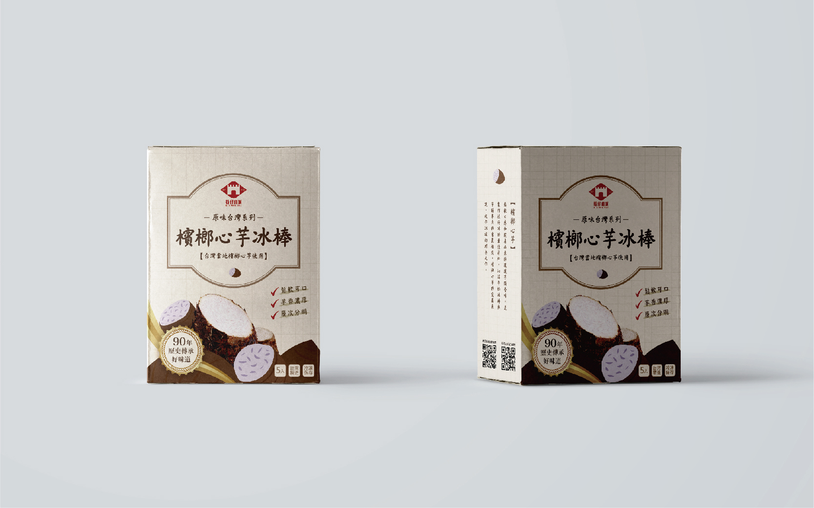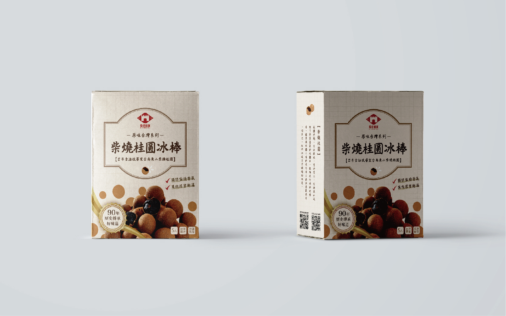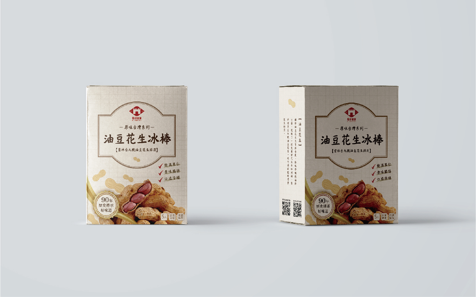 紙盒延伸冰棒內袋設計,正面以精簡扼要的文案直述原料特色與產地,並加上90年歷史傳承圓標,讓尚未認識枝仔冰城的首購顧客了解該品牌在台灣歷史悠久定位;左側面深度介紹嚴選食材採用的用心,右側面則將產品各項檢驗資訊整理歸順。