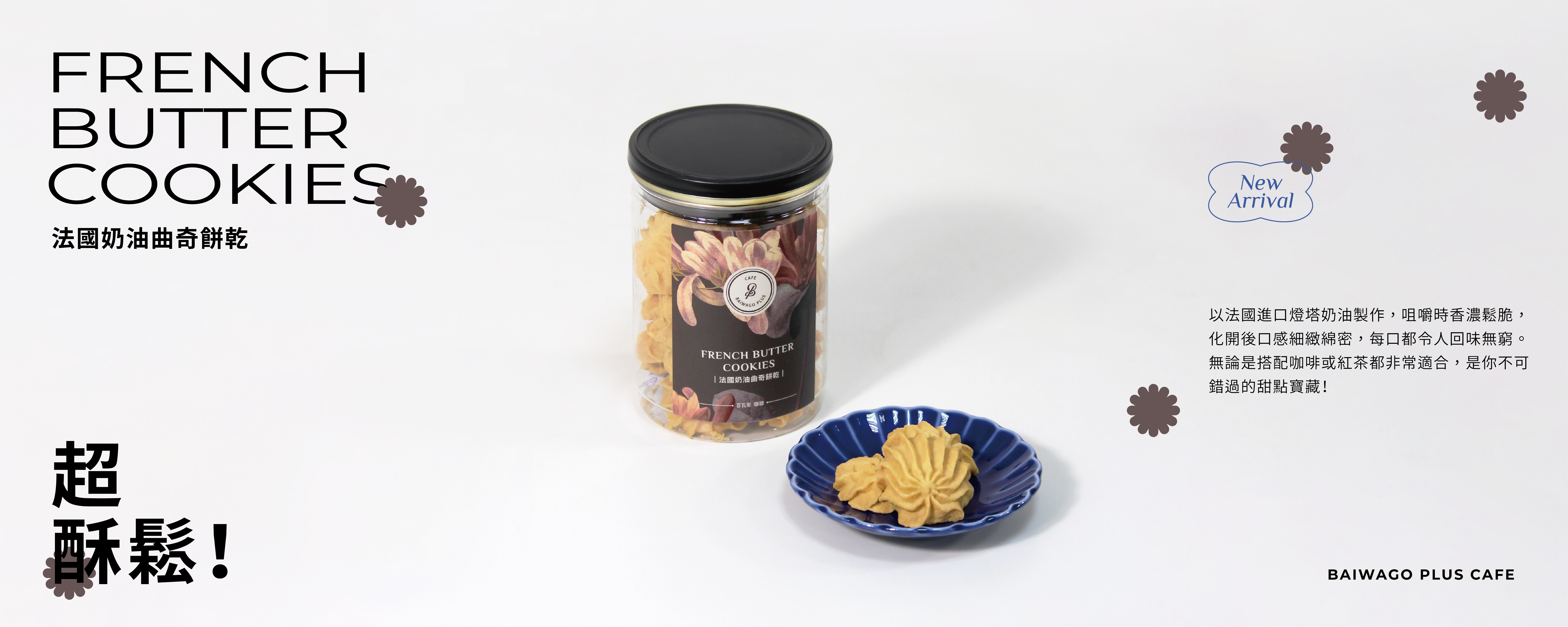 嚴選來自法國的經典奶油「燈塔奶油」製作而成,過程不添加任何防腐劑!吃起來負擔少且安心。口感酥鬆、甜度適中,而且不膩口,讓人會想一片接一片地吃!搭配百瓦哥的台灣手沖咖啡或是高山茶,是美妙的下午茶組合