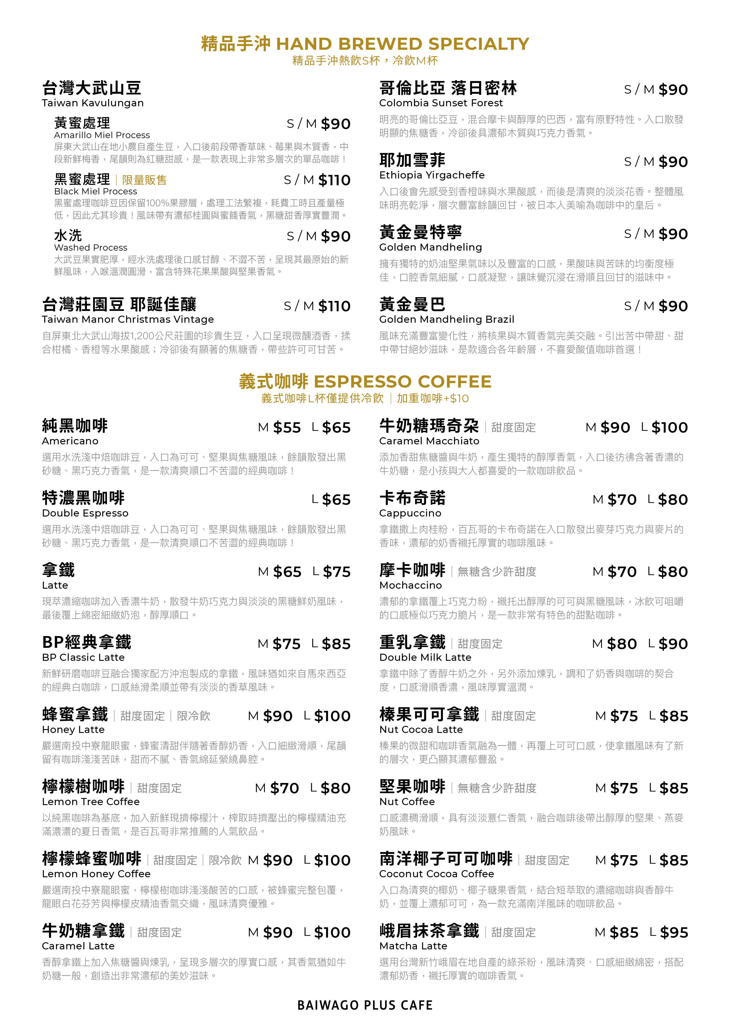精品手沖系列:台灣大武山豆 黃蜜處理(原"台灣大武山蜜處理"更名)、台灣大武山豆 黑蜜處理、台灣大武山豆 水洗、台灣莊園豆 耶誕佳釀、哥倫比亞 落日密林